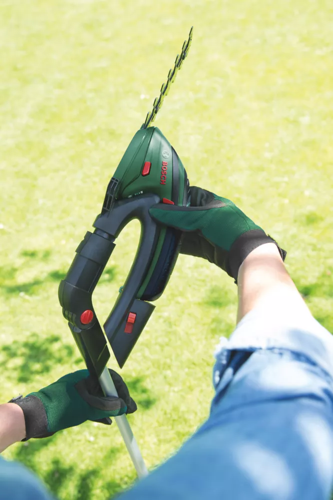 Cordless, multifunctional tool designed for shaping shrubs and lawn edges without stalling, due to the built-in Bosch Anti-Blocking System. Powered by 3.6V Li-ion battery producing up to 50 minutes of runtime. Features grass and shrub blades and ‘multi-click system’ for easy blade change. Compact, lightweight, ergonomic design for manouevrability and comfort.