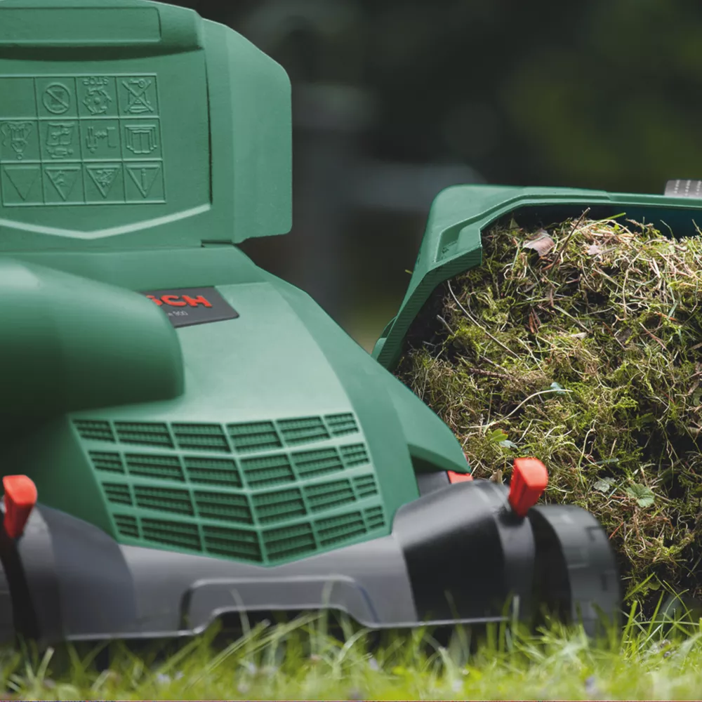Versatile lawnraker, provides excellent all-year-round results, delivering fast and effective moss and thatch removal with the jet-collect system. Features easily adjustable, 4-position operating heights for both light and heavier applications, including leaf collection. Double-fold handles and stackable collection box makes storage easy, even in small spaces.