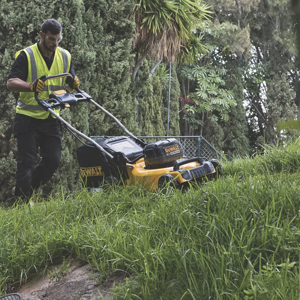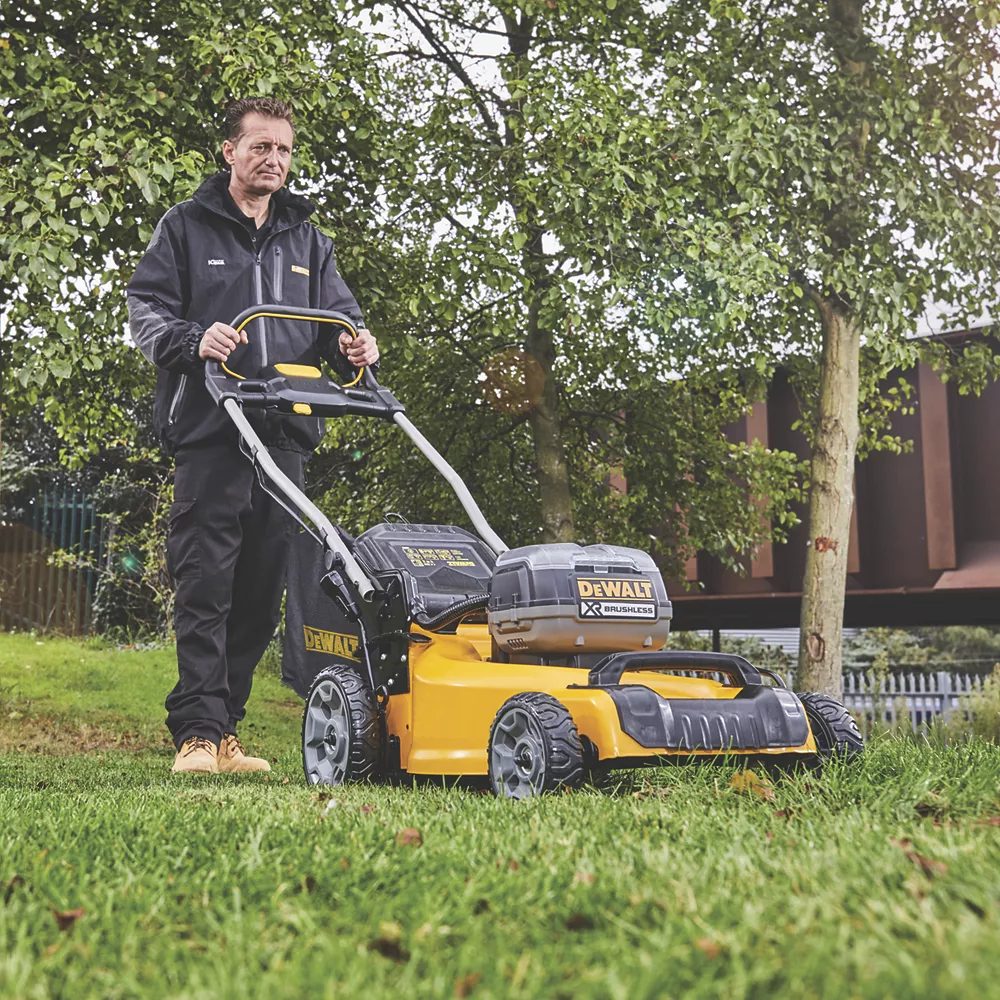Brushless, cordless rotary lawn mower with mulching facility. Ergonomic, lightweight push-handle design ensures easy and comfortable steering.