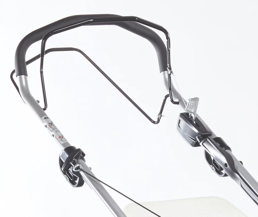 Self-propelled, variable speed lawn mower. Powered by Briggs & Stratton 675EXi ReadyStart Mow & Stow engine. Strong, durable chassis and single lever for adjusting cutting height from 25 to 77mm. Twinclip blade delivers 2 cuts, ensuring grass is cut to the desired height. Light and easy operation with reduced vibration. Robust handle bars are easily adjusted to a choice of 3 positions and can be folded over the engine for storage. Lawn mower can also be stored in an upright position. Easy to clean after use. Supplied with 70ltr grass bag and mulching plug.