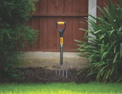 Heavy duty, heat-treated tines and steel reinforced ‘Power Ring’ socket, offering the strength of a much larger fork with the convenience of a shorter length shaft. Lightweight, fibreglass shaft with a full-size double-injected, soft D-grip handle for comfort. Ideal for loosening, lifting and turning soil in confined spaces.