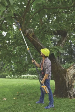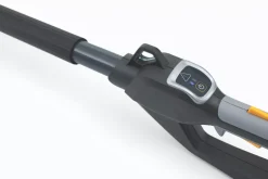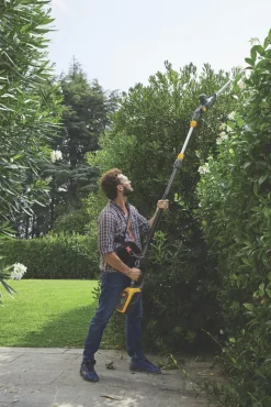 Lightweight cordless multi-tool offers high-reach hedge cutting and pruning without the noise and fumes of a petrol tool. Features 46cm dual-action laser-cut blade and 25cm cutting bar designed to fit into tight spaces, with bumper to lean against branches. Supplied with 65cm telescopic extension for a maximum reachable height of 2.95m with hedge trimmer and 2.7m with pruner saw. High-performance chain on cutting bar minimises kickbacks. Also features 112° rotating cutting head with 6 positions, soft-touch rubber grip handle and shaft, and harness hook for a safe, comfortable and precise cut. Compatible with 48V 2.0Ah battery (sold separately).