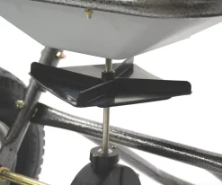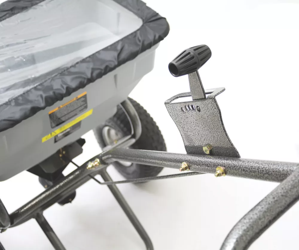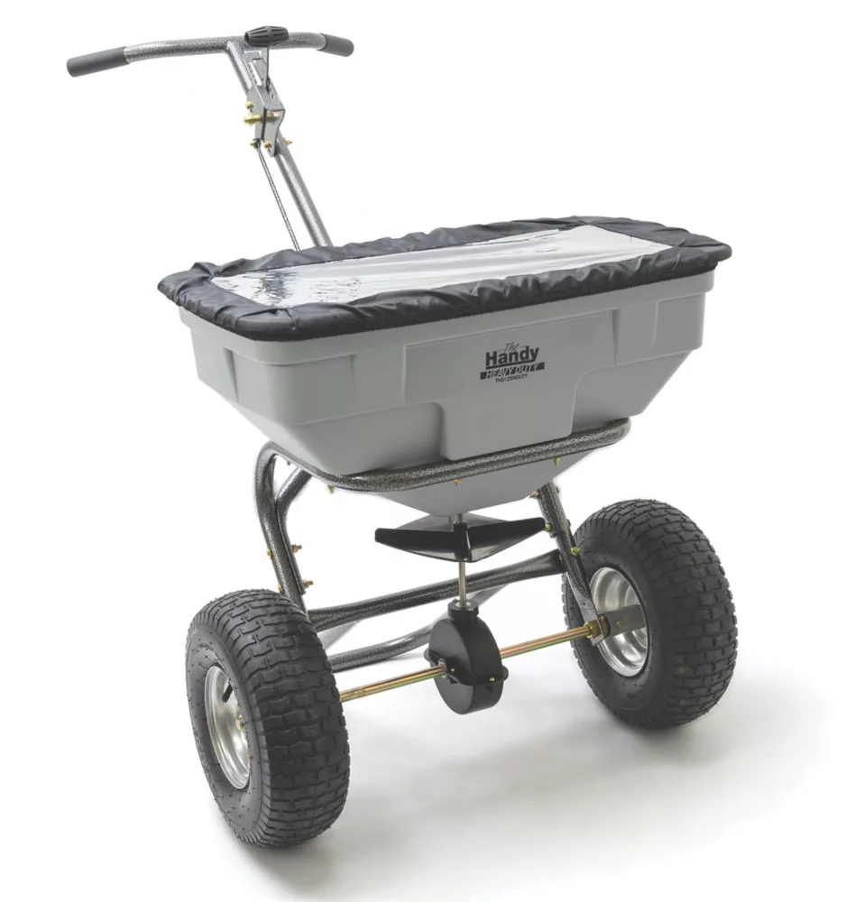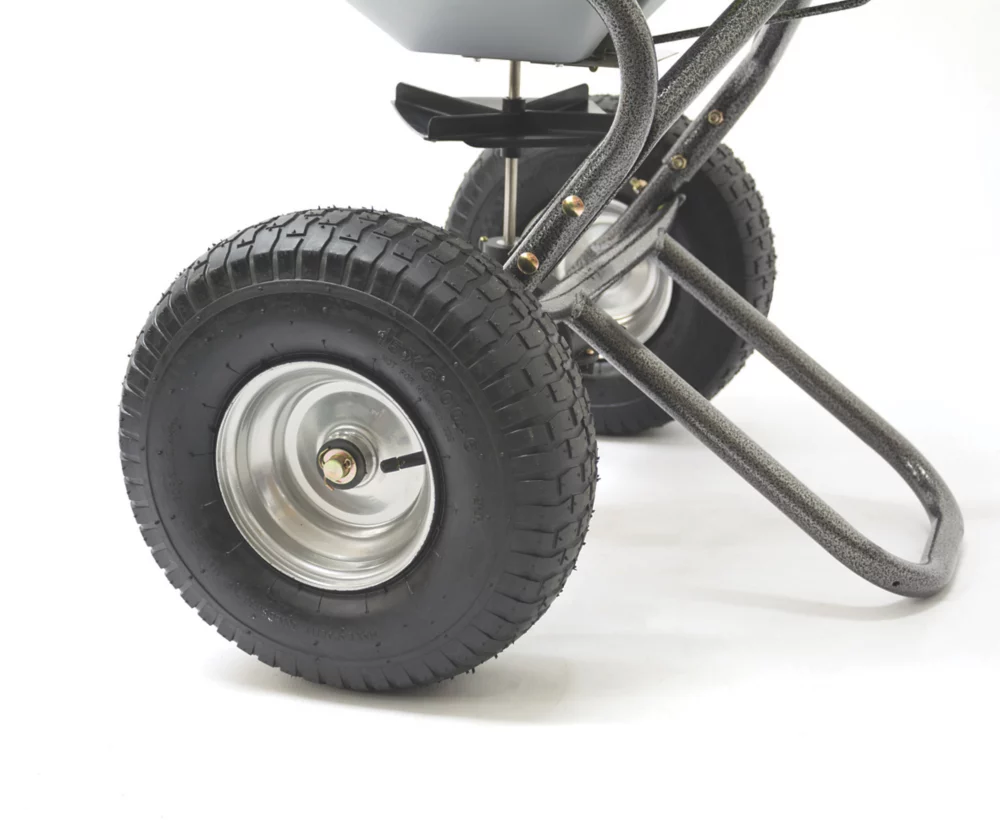Heavy duty, versatile spreader which can be used to apply ice-melts to pathways, drives and other hard-surface areas. Can also broadcast fertiliser, pesticides and grass-seeds. Features a tubular-steel frame, an all-metal transmission, ergonomic T-bar handle and a corrosion-resistant poly hopper. Supplied with wide-profile pneumatic tyres for use across rough terrain and a hopper screen for operation in all weather conditions.