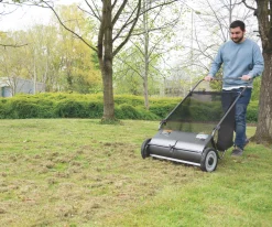 Practical and convenient push-type sweeper combining a substantial 66cm working width with a huge 200Ltr collector for extended periods of operation. Features height adjustment for multi-surface use and large 25cm diameter wheels for no-slip traction, even on hard ground. Its durable sweeper brush is powered by the action of the wheels on the ground, rotating 4½ times for every turn of the wheels, resulting in a thorough pick-up and a neat, debris-free lawn. Can be set-up to perform successfully on a variety of surfaces, including grass, tarmac, concrete and gravel.