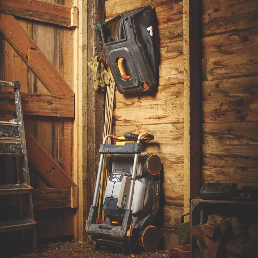 Brushless, cordless rotary lawn mower with vertical storage. Provides easy access to the underside of the deck for cleaning and maintenance and reduces the storage footprint. Features central height adjustment for simple switching between cutting heights. Grass collection indicator to show when collection bag needs emptying. Coverage on full battery of up to 400m².