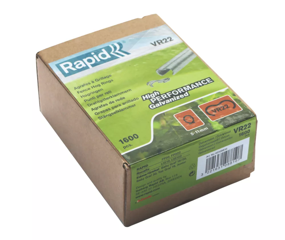 Cost effective galvanised netting clips, compatible with the Rapid FP222 Fencing Plier (Code 9981F). For permanently joining line wires to netting and light welded mesh. Clips come in ready to use collated strips for ease of loading.
